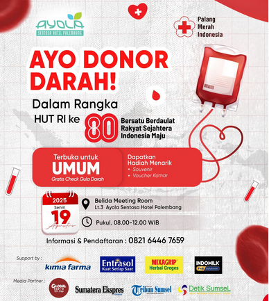 Dengan segala fasilitas yang disiapkan dan kemudahan akses bagi masyarakat umum, donor darah di Ayola Sentosa Hotel Palembang diperkirakan akan menarik antusiasme tinggi. Momentum kemerdekaan ini pun menjadi lebih bermakna dengan adanya kontribusi langsung terhadap kemanusiaan. (rd)